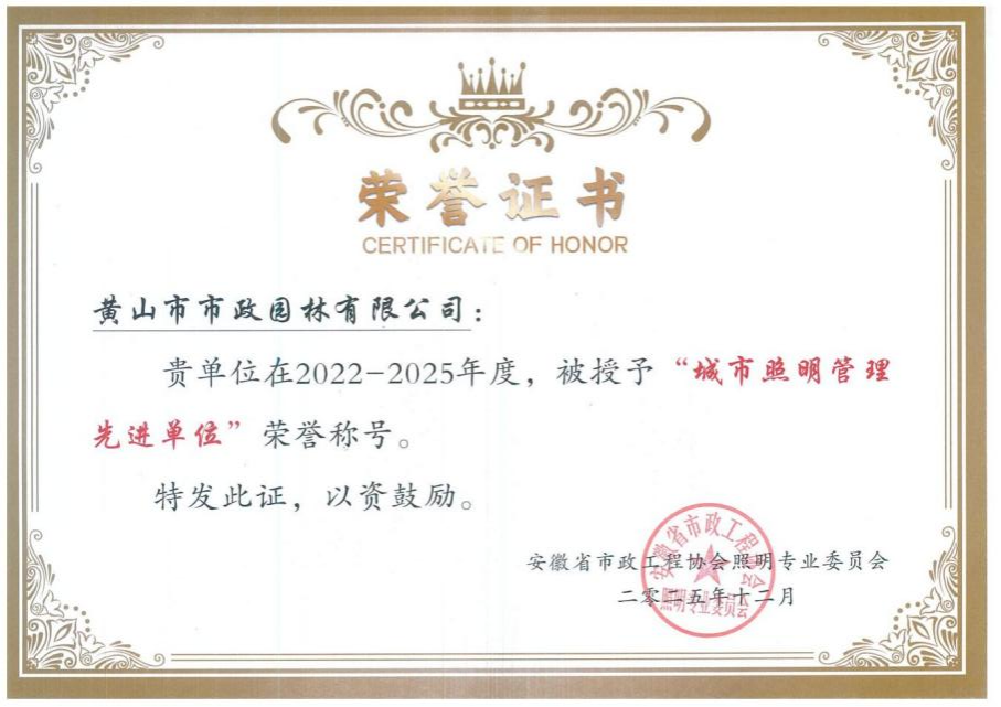 近日,黃山市市政園林有限公司及個(gè)人分別被安徽省市政工程協(xié)會(huì)照明專(zhuān)業(yè)委員會(huì)授予2022-2025年度“城市照明管理先進(jìn)單位”及“城市照明先進(jìn)個(gè)人”稱(chēng)號(hào),該榮譽(yù)是對(duì)市政園林公司在照明精細(xì)化管理、節(jié)能技術(shù)創(chuàng)新應(yīng)用及民...查看詳情 -
